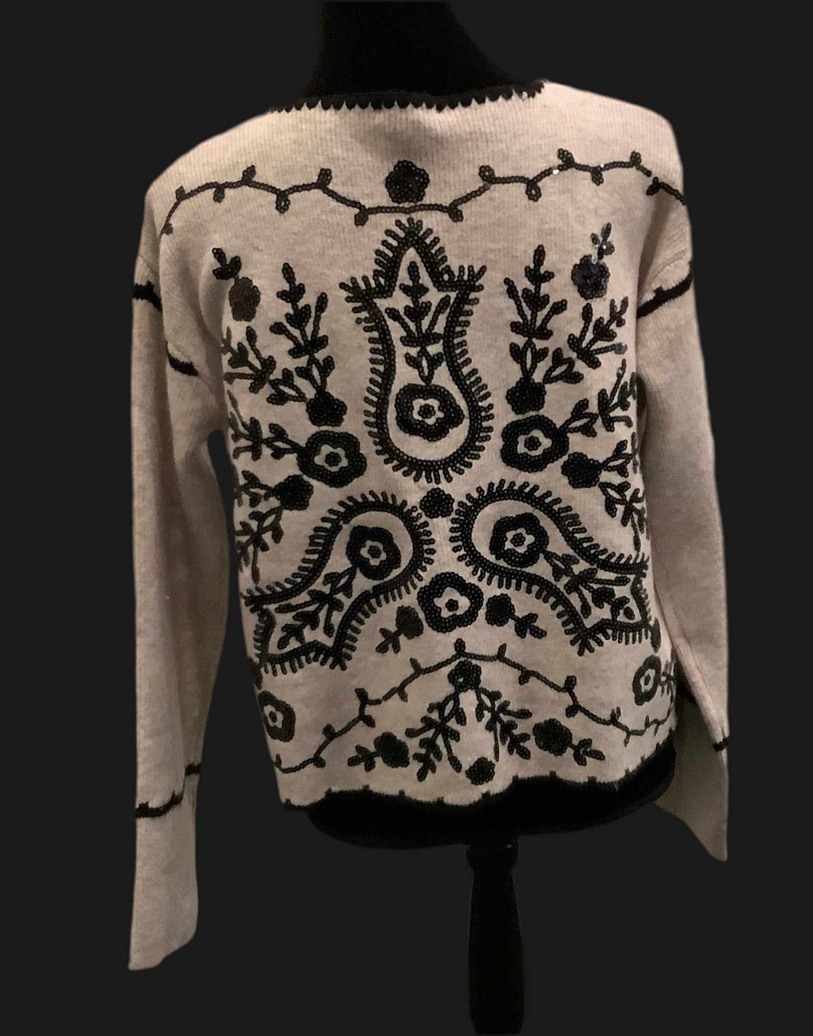 Oatmeal Heather Long Sleeve, Round Notched Neck Sweater w/Black Sequin Detail on Back by Orly.