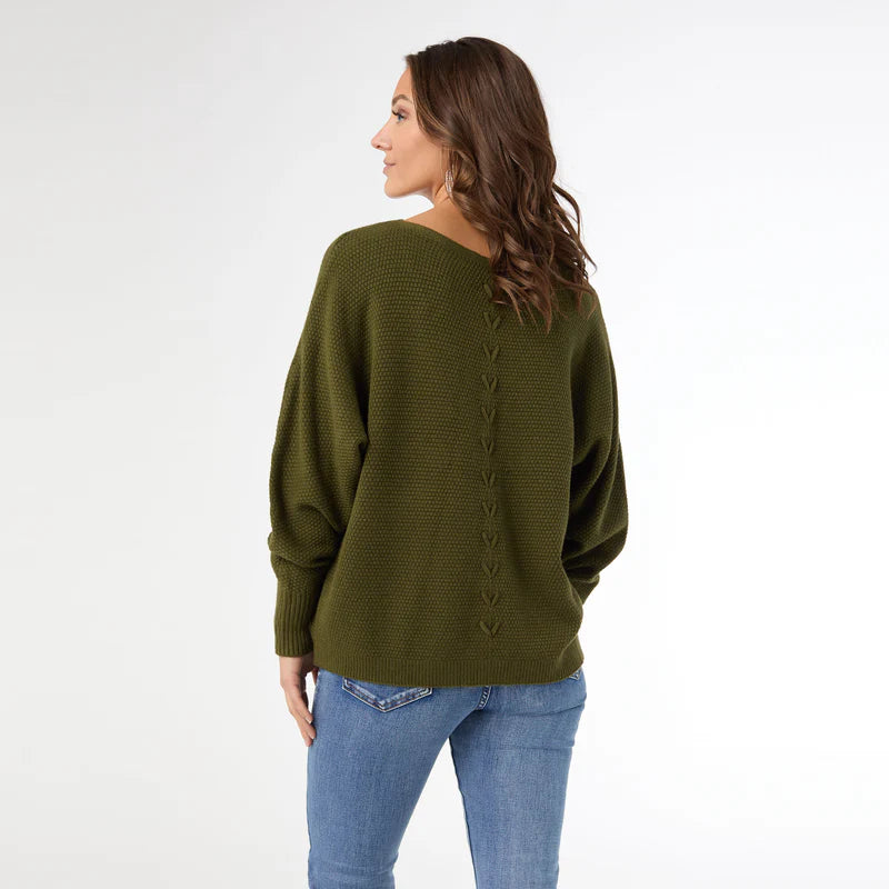 Army Green Boat Neck, Lattice Back Detail Sweater by Coco and Carmen. 100% Acrylic