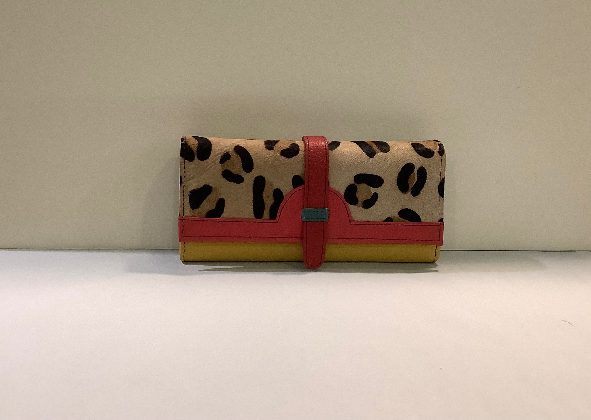 Yellow/Tan/Animal Print on Front and Navy on Reverse Side Wallet by Soruka. Made from Recycled Leather. Each Purse is a One of a Kind. 8” W X 4” H